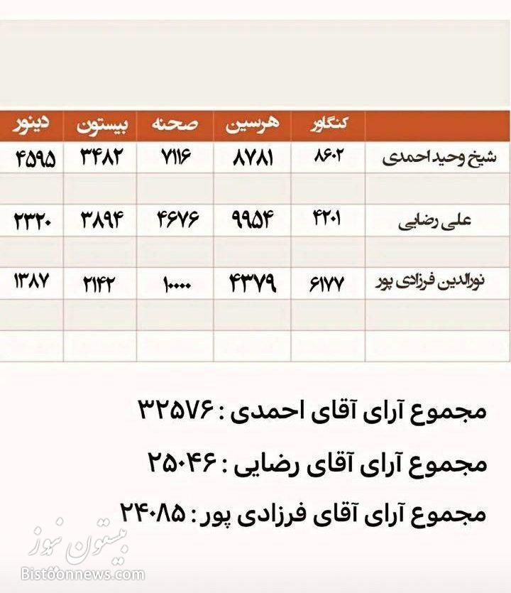 🟢 نتیجه انتخابات مجلس شورای اسلامی در حوزه انتخابیه کنگاور،صحنه و هرسین وحید احمدی 32576علی رضایی 25035نورالدین فرزادی پور 24085عبدالله عزیزی 3647محمدرضا حیدری 2730حمیدرضا عسکری شکوه. 2021سیده ناهید خاموشی سرابی 1194جعفر رفیعی 841علی بدری 500موسی آبختی ...