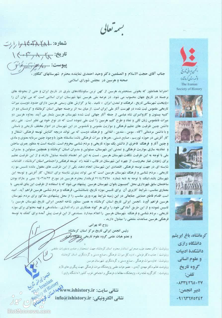 جناب آقای حجت الاسلام و المسلمین دکتر وحید احمدی نماینده محترم شهرستانهای کنگاور ، صحنه و هرسین در مجلس شورای اسلامی احتراما همانطور که بخوبی مستحضرید هرسین از کهن ترین سکونتگاههای بشری در تاریخ ایران و حتی از محوطه های برجسته در تاریخ جهان محسوب می شود .در عرصه ملی هرسین تنها شهرستان ایران اسلامی است که می توان آن را «پایتخت شهرستانی تاریخ ، فرهنگ و تمدن ایران » نامید. بنا بر گزارش های رسمی هرسین دارای حدود دویست میراث تاریخی ملموس ثبت شده در فهرست آثار ملی ایران است. از میان سه اثر برجسته جهانی استان کرمانشاه و کردستان دو اثر کتیبه بیستون و کاروانسرای شاه عباسی از جمله آثار جهانی ثبت شده شهرستان هرسین بشمار می آیند. بعلاوه هرسین دو میراث ناملموس زبان لکی و نماد و طرح گلیم هرسین را ثبت ملی نموده است که در نوع خود بی نظیر است. علی رغم داشتن چنین ظرفیت های عظیم فرهنگی و مواریث ملموس و ناملموس در این شهرستان در ادوار مختلف تاریخی و باستانی و با داشتن مردمانی آگاه ، مومن ، متدین ، انقلابی و فرهنگ دوست که می تواند دریچه گشایش توسعه فرهنگی، اشتغال و کار آفرینی در حوزه توریسم ، صنایع دستی ، هنرها و میراث فرهنگی باشد؛ متاسفانه هنوز با وجود چنین سرمایه معنوی و مادی و چنین آثار و فرهنگ فاخری از داشتن یک موزه تاریخی و مردم شناسی محروم است .شایسته است به منظور بصری ساختن و نمادینه سازی مواریث فرهنگی و تمدنی این شهرستان، مسئولین و مدیران استان کرمانشاه و همچنین مسئولین و مدیران ملی با توجه به این ظرفیت شگفت شهرستان هرسین ، نسبت به این امر اهتمام شایسته مبذول دارند و از این ظرفیت عظیم برای زدودن غبار محرومیت از چهره این شهرستان در قالب « نقشه راه توسعه فرهنگی و اجتماعی استان کرمانشاه » اقدامات شایسته ای در جهت توسعه فرهنگی، اقتصادی این شهرستان انجام دهند یکی از این ظرفیت های مغفول مانده تاسیس مو زه تاریخی ، مردم شناسی و فرهنگ شهرستان هرسین است که می تواند بستری شایسته برای اشتغال، کار آفرینی و توسعه این شهرستان باشد.اینک با توجه به نامه شماره ۳۴۹۸/۷۱۱۴ فرماندار محترم هرسین در مورخ ۲۳/۸/۱۴۰۳ مبنی بر مازاد بودن ساختمان سابق شهرداری محل کمیسیون بانوان شهرستان هرسین پیشنهاد می شود که با استفاده از ظرفیت این بنای قدیمی با معماری مناسب ، شرایط کاربری آن برای تاسیس موزه تاریخ، باستانشناسی، فرهنگ و مردم شناسی هرسین فراهم آید . امید است اقدام قاطع حمایتی جنابعالی در این زمینه شرایط بهره وری مناسب را از محل پیشنهادی مذکور برای مردم شهرستان هرسین فراهم آورد. انجمن ایرانی تاریخ استان کرمانشاه به همین منظور شاخه انجمن ایرانی تاریخ شهرستان هرسین را تاسیس نموده و از این طریق آمادگی خود را برای هر گونه همکاری در راه اندازی ، ساماندهی و تهیه محتوای برای موزه تاریخی ، مردم شناسی و فرهنگ شهرستان هرسین را اعلام میدارد. مستدعی از این فرصت پیش آمده برای کمک به توسعه فرهنگی هرسین مساعدت مقتضی را مبذول دارید. روح اله بهرامیرئیس انجمن ایرانی تاریخ مرکز استان کرمانشاهو عضو هیات علمی گروه علوم تاریخی دانشگاه رازی رونوشت : دکتر محمد طیب صحرایی استاندار محترم استان کرمانشاه جهت استحضار و صدور دستورات مقتضیرونوشت : جناب دکتر فرمانی ، اداره کل میراث فرهنگی ، صنایع دستی و گردشگری استان کرمانشاه رونوشت : اداره میراث فرهنگی ، صنایع دستی و گردشگری شهرستان هرسین رونوشت خانم دکتر مهدی آبادی ، عضو هیات علمی پژوهشگاه میراث فرهنگی جهت پیگیری های لازم رونوشت : کارگروه نقشه راه ، پژوهشکده مطالعات فرهنگی و اجتماعی غرب کشور ( دانشگاه رازی )